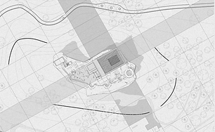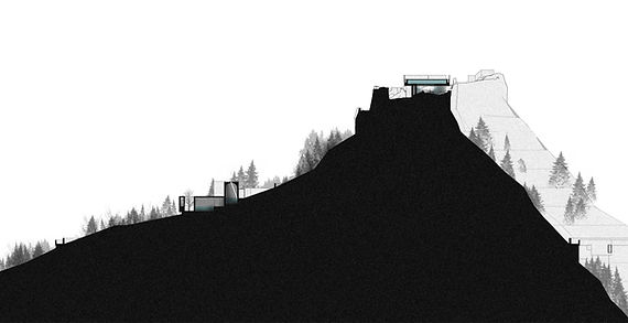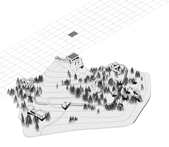 Uma muralha emerge como uma camada espessa de topografia que transporta o usuário a um caminho principal ao qual estão ligados os diferentes edifícios do programa. Esta linha envolve o sítio, criando uma banda(?) sutil que compõe a borda da intervenção e que consegue explorar a anteriormente inacessível porção norte da colina. A experiência da promenade é definida pela própria morfologia da curva de nível, com curvas sinuosas que intensificam a experiência com a natureza e criam diferentes vistas para as montanhas circundantes.